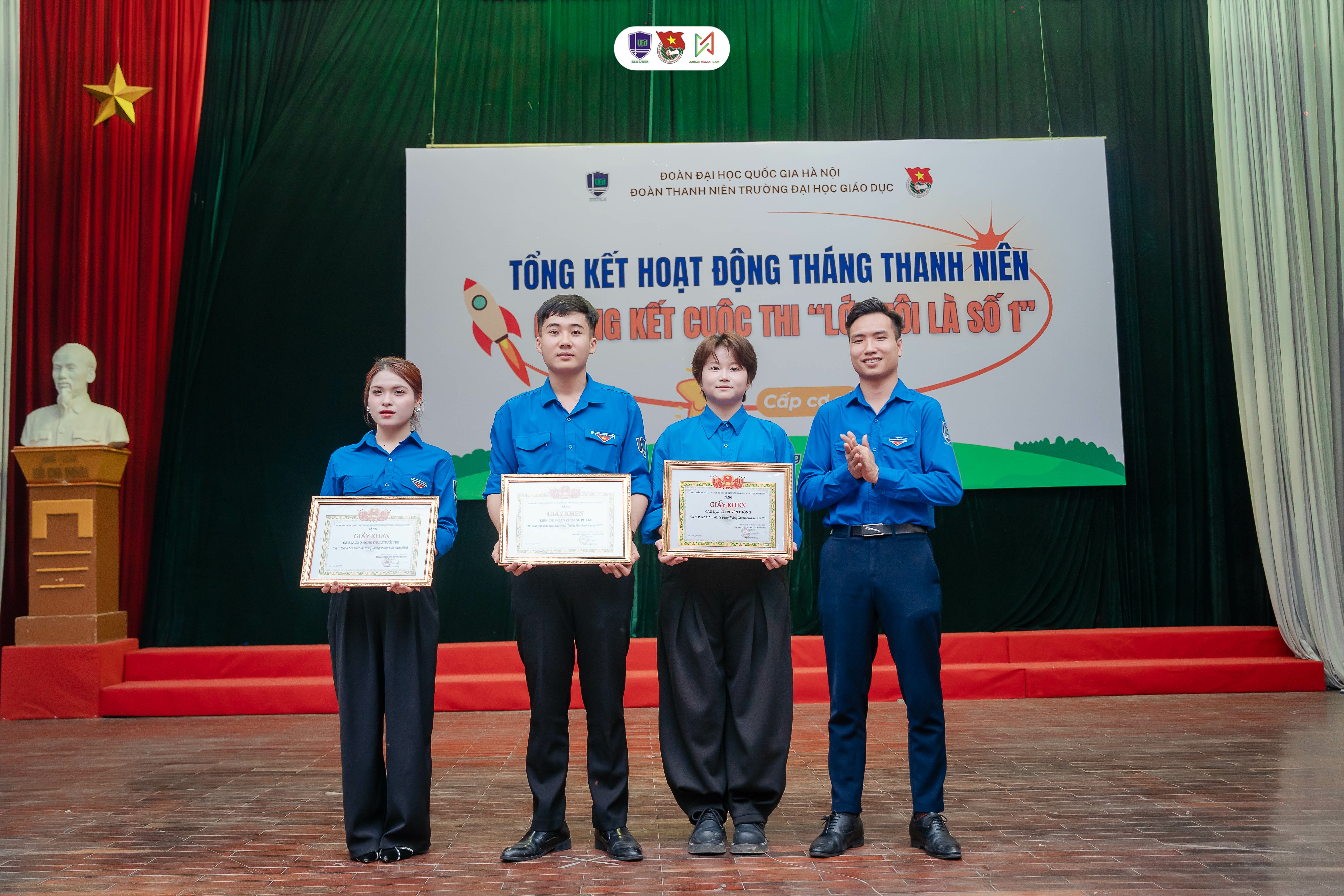 Đồng chí Nguyễn Văn Hưng - Bí thư Đoàn Thanh niên trường Đại học Giáo dục trao giấy khen cho CLB Nghệ thuật tuổi trẻ; Liên chi Đoàn khoa Sư phạm; CLB Truyền thông (JMT)