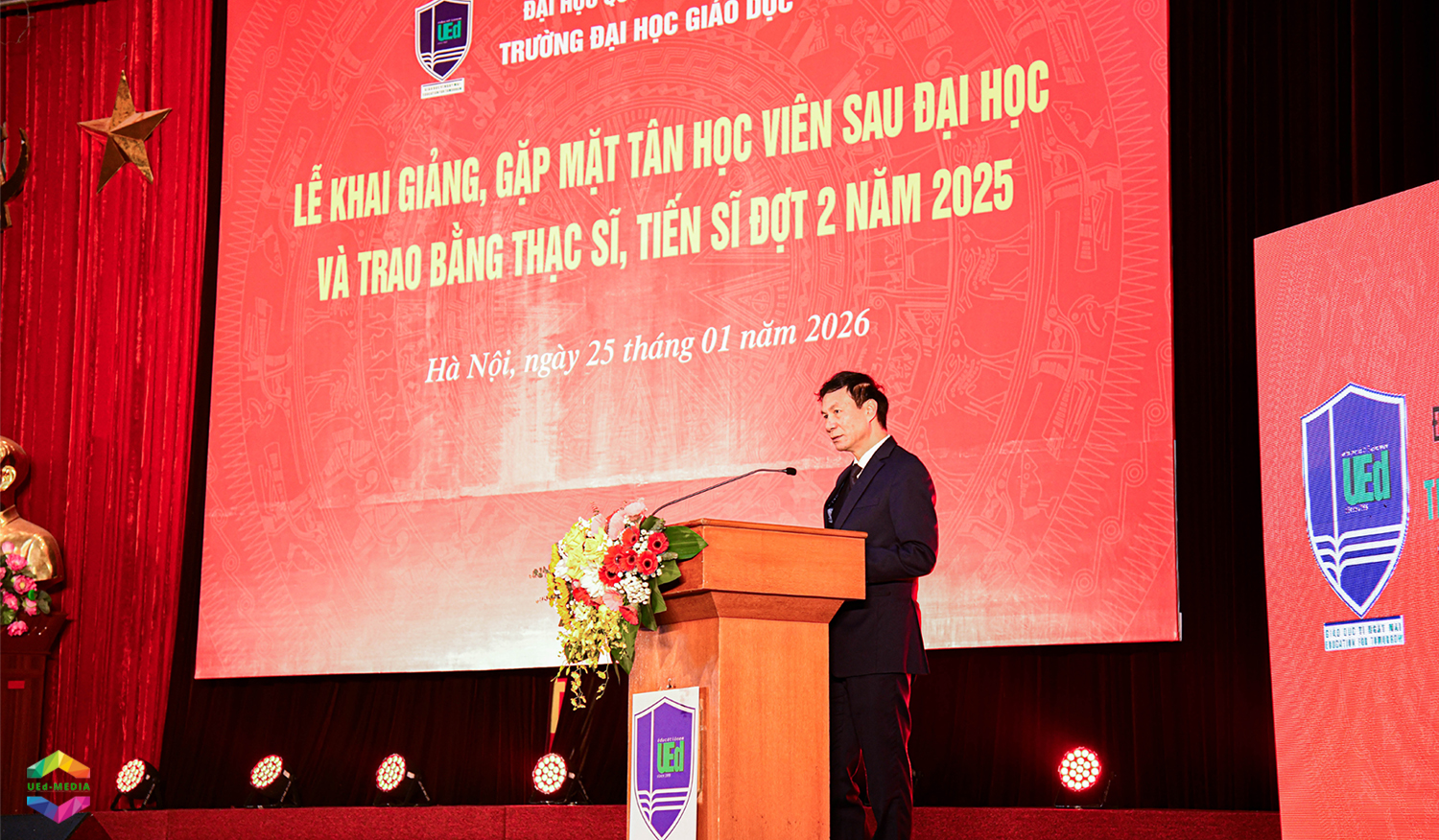 Phát biểu khai mạc buổi lễ, GS.TS.NGƯT. Nguyễn Quý Thanh – Hiệu trưởng Trường Đại học Giáo dục nhấn mạnh buổi lễ là dấu mốc học thuật quan trọng, ghi nhận hành trình học tập, nghiên cứu nghiêm túc và bền bỉ của người học, đồng thời mở ra giai đoạn phát triển chuyên môn và cống hiến mới. Trong bối cảnh giáo dục đại học Việt Nam chuyển mạnh sang chú trọng chất lượng, hiệu quả và phát triển năng lực người học gắn với thực tiễn, đào tạo sau đại học được đặt trong yêu cầu cao hơn về chuẩn mực học thuật, năng lực nghiên cứu độc lập, tư duy phản biện, đạo đức nghiên cứu và trách nhiệm xã hội. Tấm bằng được trao không phải là điểm kết thúc mà là khởi đầu cho hành trình học thuật chuyên sâu, nơi tri thức khoa học cần tiếp tục được gắn kết chặt chẽ với thực tiễn nghề nghiệp và nhu cầu phát triển của xã hội.