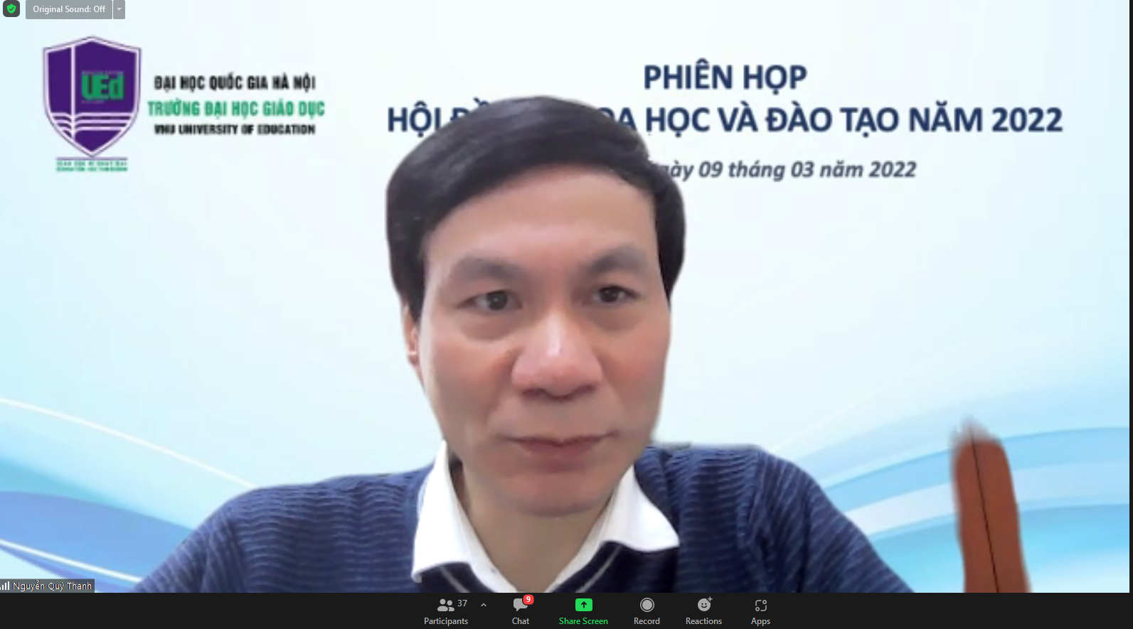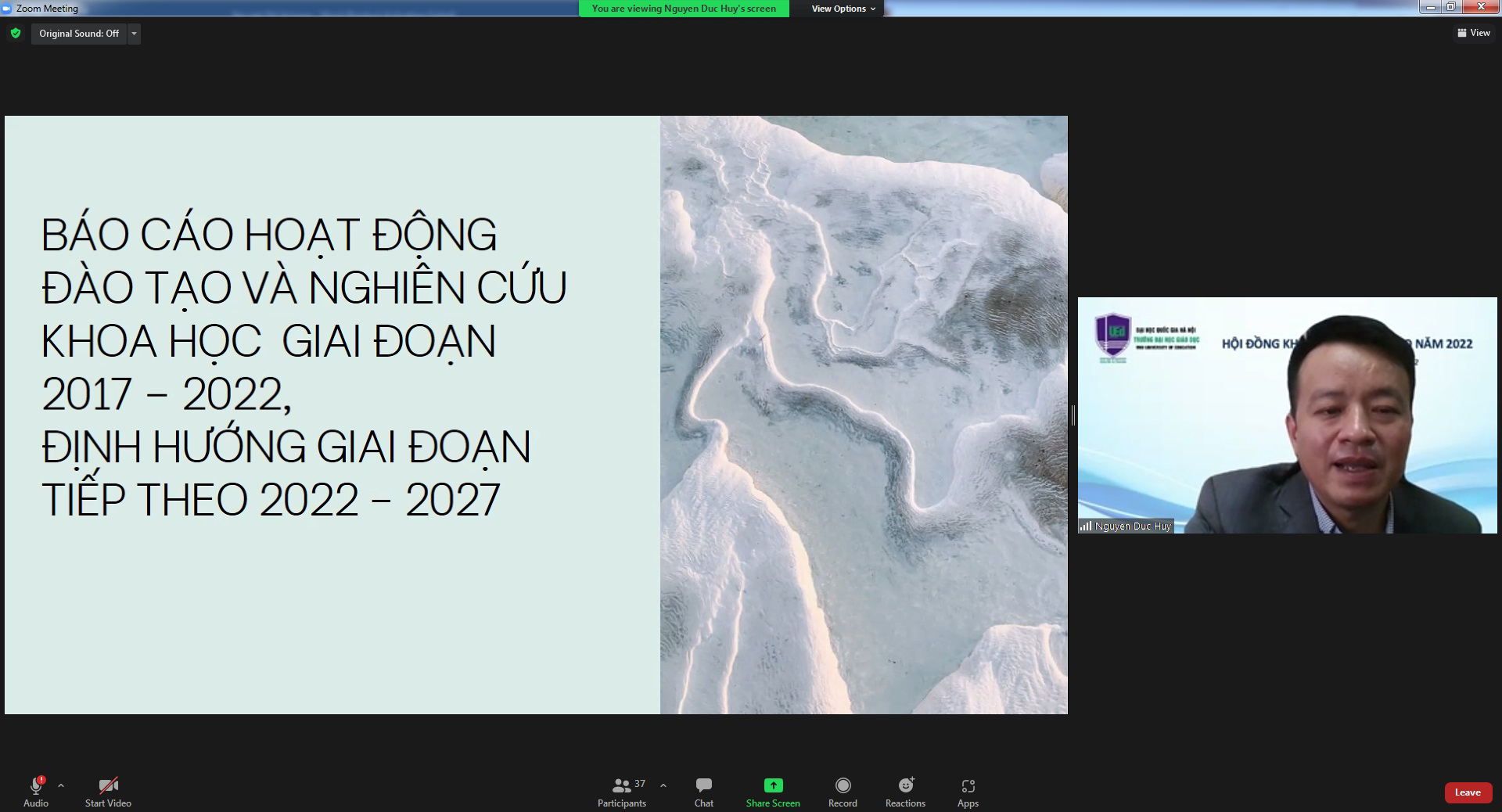 Đối với các nhiệm vụ trọng tâm trong phương hướng hoạt động nghiên cứu khoa học giai đoạn 2022-2027, thay mặt Trường ĐH Giáo dục TS. Nguyễn Đức Huy đã đề xuất xin ý kiến Hội đồng 5 nội dung: (1) Nghiên cứu chuyển đổi số trong giáo dục và sư phạm; (2) Tập trung nghiên cứu công nghệ và dữ liệu số trong giáo dục; (3) Nghiên cứu công cụ chuyển hóa để đánh giá năng lực; (4) Đánh giá thích ứng; (5) Duy trì các hướng nghiên cứu mạnh.