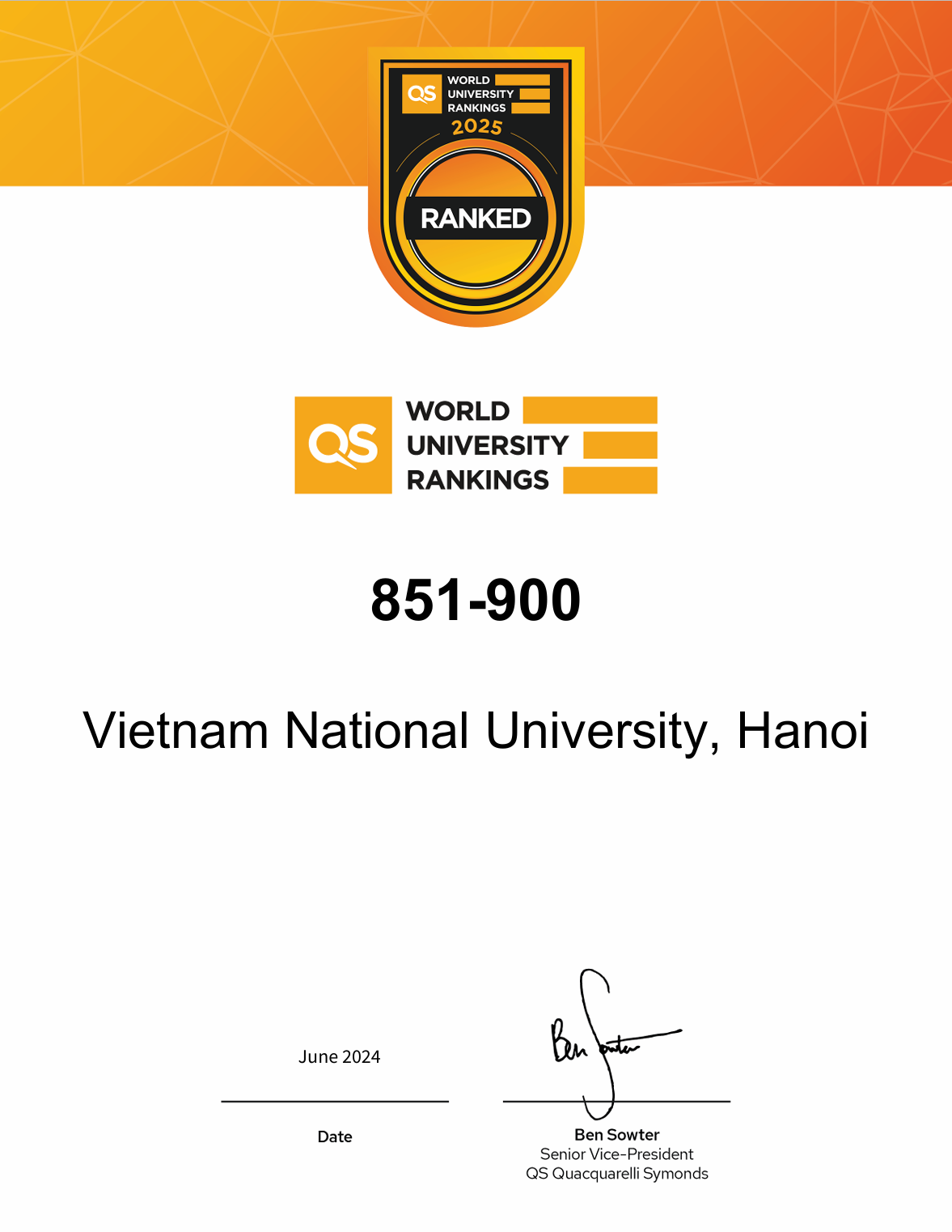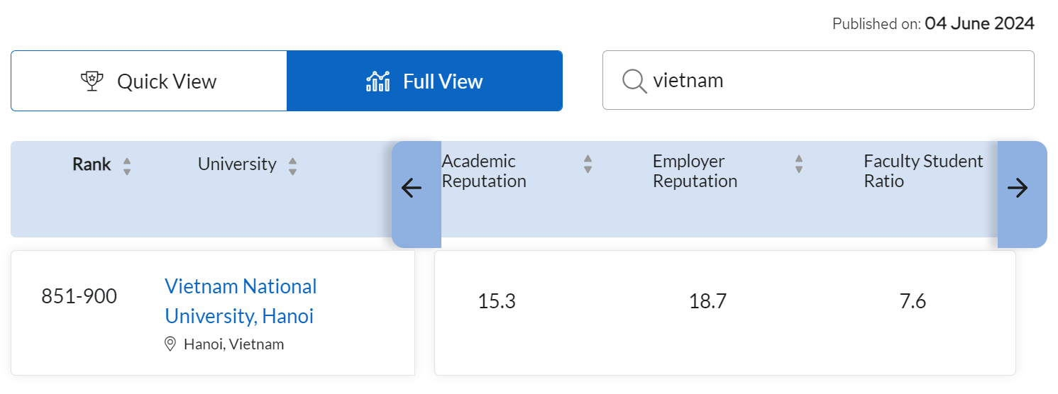 ĐHQGHN tiếp tục duy trì vị trí trong nhóm 900 trường đại học hàng đầu thế giới theo kết quả xếp hạng mới nhất của bảng QS WUR 2025 (Nguồn: QS)