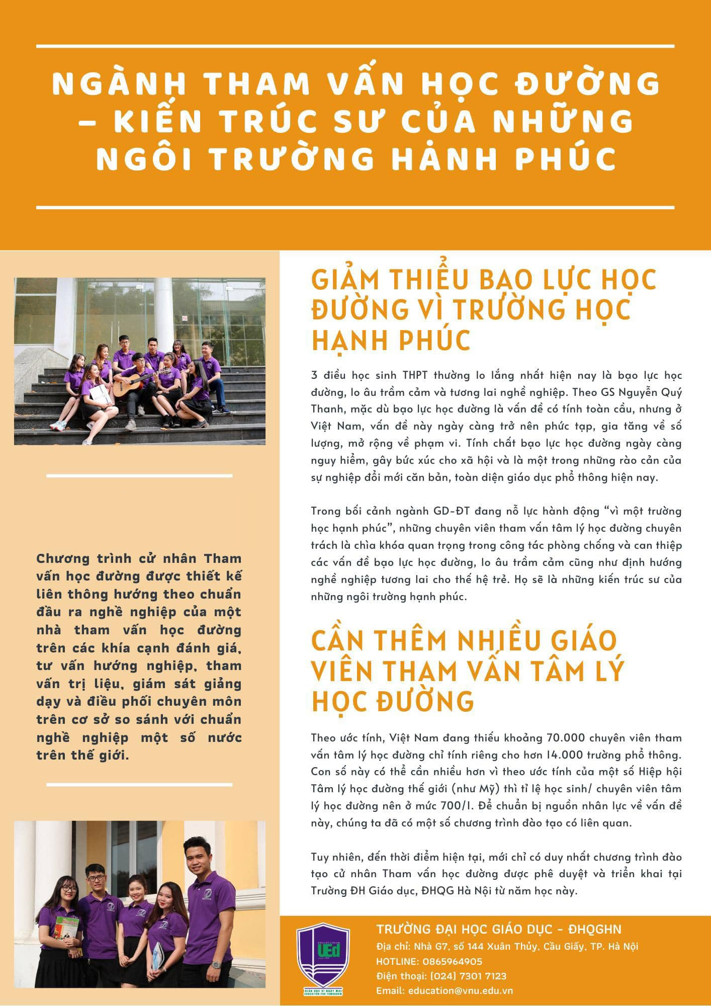 "Chương trình Cử nhân Tham vấn học đường được thiết kế liên thông hướng theo chuẩn đầu ra nghề nghiệp của một nhà tham vấn học đường trên các khía cạnh đánh giá, tham vấn trị liệu, giám sát giảng dạy và điều phối chuyên môn trên cơ sở so sánh với chuẩn nghề nghiệp một số nước trên thế giới"