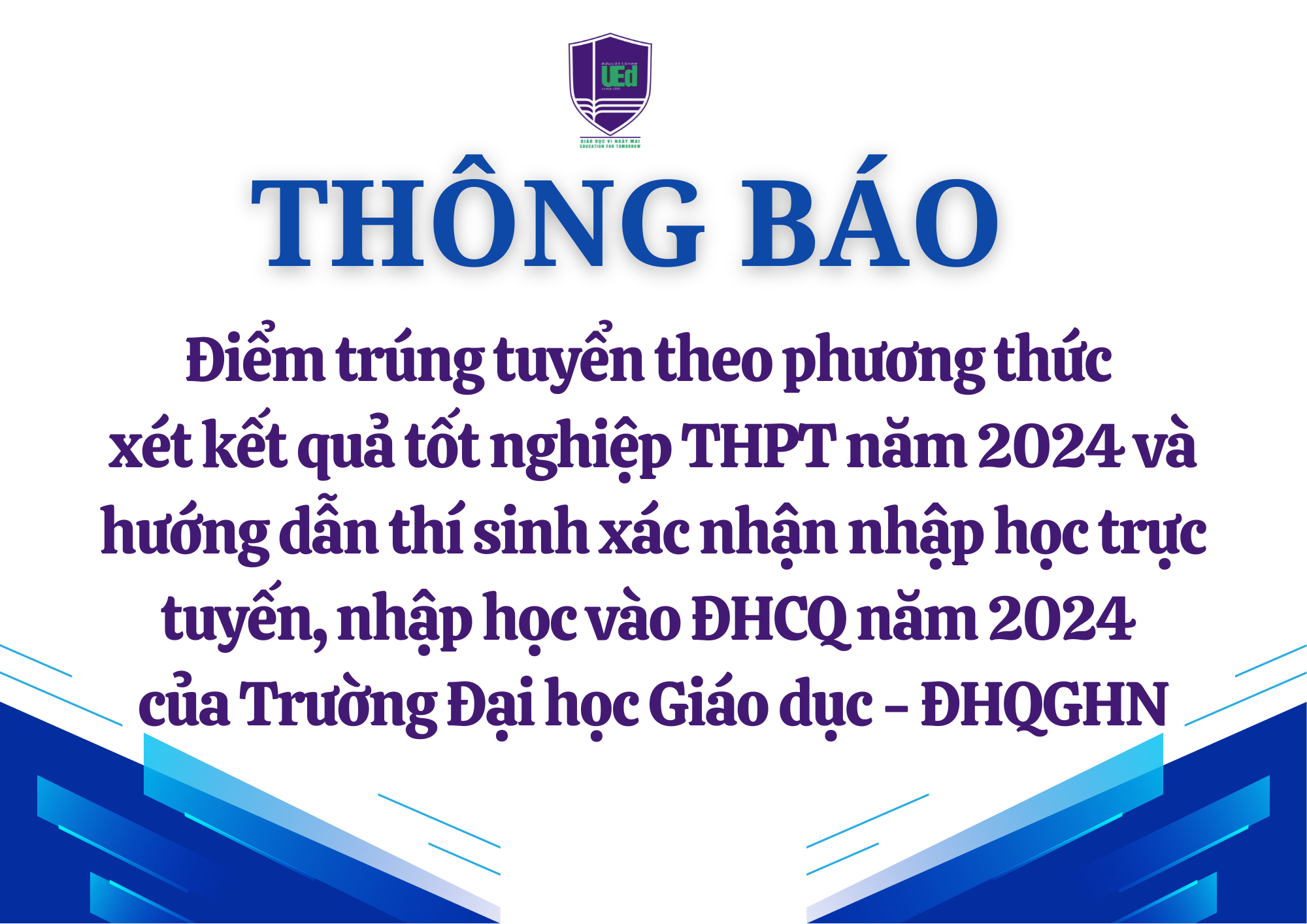 Trường Đại học Giáo dục ban hành theo văn bản số 1145/KH-ĐHGD ngày 24/4/2024, chậm nhất đến 17 giờ 00 phút, ngày 27/08/2024, thí sinh thực hiện xác nhận nhập học trực tuyến trên Hệ thống tuyển sinh của Bộ Giáo dục và Đào tạo. Trường Đại học Giáo dục thông báo điểm trúng tuyển theo phương thức xét kết quả thi tốt nghiệp THPT năm 2024 (gọi tắt là điểm trúng tuyển) vào các nhóm ngành/ngành đào tạo đại học hệ chính quy năm 2024 của Trường và hướng dẫn thí sinh các bước xác nhận nhập học trực tuyến và nhập học trực tiếp như sau:
