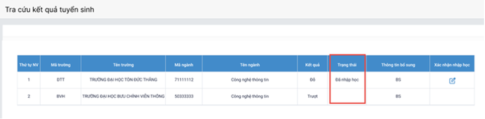 Bước 6: Kiểm tra lại trạng thái Đã nhập học