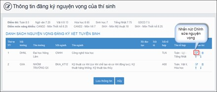 3. Màn hình hiện thị các nguyện vọng đăng ký trước đó của thí sinh sẽ được hiện thị. Rà soát đọc kỹ trước khi ấn nút "Chỉnh sửa nguyện vọng" để sửa nguyện vọng.