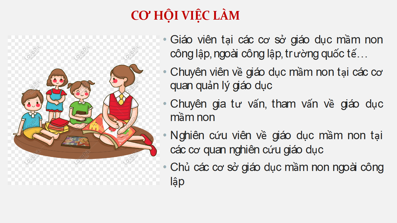 Nhờ môi trường đào tạo chuyên nghiệp và tiên tiến nên, sinh viên Mầm non sau khi tốt nghiệp ở ngôi trường ĐH Giáo dục chắc chắn có nhiều cơ hội việc làm đa dạng và tốt như: