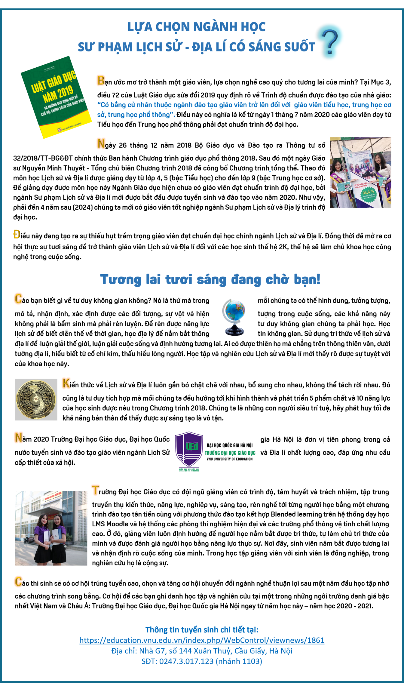 Dạy học tích hợp đang trở thành một xu hướng mới trong Nhà trường. Trong năm 2020, Trường Đại học Giáo dục chính thức tuyển sinh ngành Sư phạm Lịch sử - Địa lý. Để tìm hiểu rõ hơn thông tin về ngành học mới này, từ đó có những lựa chọn sáng suốt cho tương lai, mời quý độc giả theo dõi thông tin dưới đây: