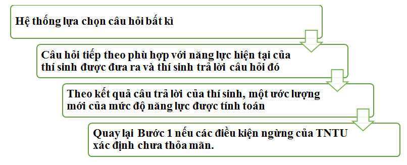 Về hoạt động của CAT, có thể hình dung hệ thống TNTU cố gắng bắt chước phương pháp đánh giá của một người giáo viên đối với học sinh. Có nghĩa là, lần đầu tiên hệ thống cung cấp cho thí sinh một câu hỏi vừa đủ khó đối với thí sinh. Nếu thí sinh trả lời câu trả lời một cách chính xác, thì sau đó một câu hỏi khó hơn sẽ được đề nghị và nếu không một câu hỏi có độ khó thấp hơn được đề nghị. Quá trình này nên được lặp đi lặp lại cho đến khi có đủ bằng chứng để xác định trình độ kiến thức của thí sinh. Trong TNTU, quá trình này được thực hiện một cách tự động. Ban đầu có thể tạm thời ước lượng một mức năng lực của thí sinh, sau khi đặt ra một câu hỏi và thí sinh trả lời. Một ước lượng mới về năng lực của thí sinh sẽ được tính toán lại. Với ước tính này, câu hỏi kế tiếp sẽ được chọn một cách chính xác hơn. Ta có thể xem TNTU như là một thuật toán lặp với thông số đầu vào là ước tính ban đầu về mức độ năng lực của thí sinh, thuật toán được bao gồm các bước sau: