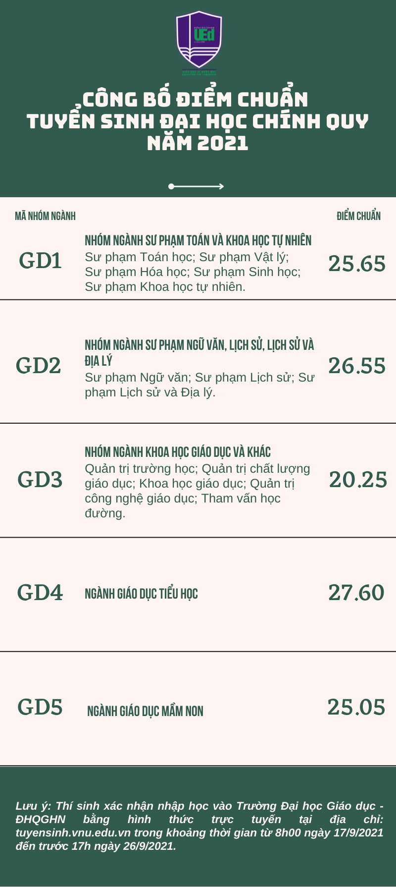 Chúc mừng hơn 1000 tân sinh viên đã trúng tuyển vào Trường Đại học Giáo dục với điểm chuẩn cao hơn so với năm 2020. Năm 2021, điểm chuẩn các ngành đào tạo giáo viên đều từ 25.05 điểm trở lên, cao nhất là ngành Giáo dục tiểu học với điểm chuẩn là 27.60 điểm.